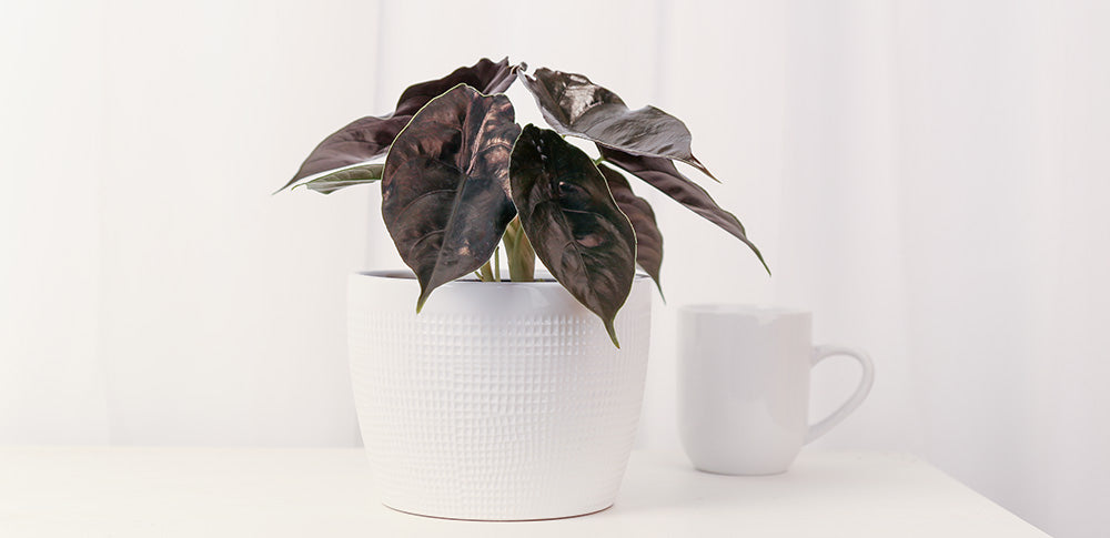 This type of Alocasia shows off lovely dark green leaves (which can appear nearly black) heavily infused with purple. When viewed in bright light, the purple may take on a metallic tone, and lavender-purple veins may become visible. This makes the plant a standout on its own or paired with other types of Alocasia (and other houseplants, too).