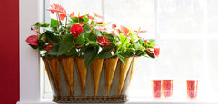 Anthuriums are cheery, exotic flowering houseplants that offer glossy, green heart-shaped leaves topped by heart-shaped pink, red, or white long-lasting blooms. Happily, anthuriums bloom almost all year long if they get enough light, fertilizer, and moisture.The brightly colored flowers make anthuriums perfect plants for centerpieces and tabletops. They grow well on their own or mix them with other bold tropicals such as red aglaonema for a knock-out look. Accent their colorful flowers with bold pots; for example, red-flowering anthuriums are stunning in red, white, or black ceramic pots for a classic look.