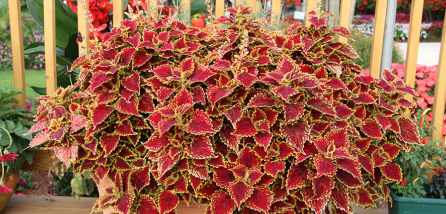 Add bold color to sunny or shady spots with the jewel-toned foliage of coleus. Once thought of as only a shade plant, newer varieties of coleus are now available in a rainbow of colors that can thrive in full sun. Coleus are also super easy to grow. Just give them some slightly moist soil and stand back! You can almost hear them growing taller every day. The plants grow between 12 and 24 inches tall. Coleus come in a myriad selection of colors, bi-colors, and mixed patterns so you won't have any trouble finding one or two in your favorite shade. Just be sure to read the label so you know if the variety you select prefers a sunny or shady site. Coleus also produce spikes of small blue flowers in the late summer that attract butterflies.Coleus Questions?